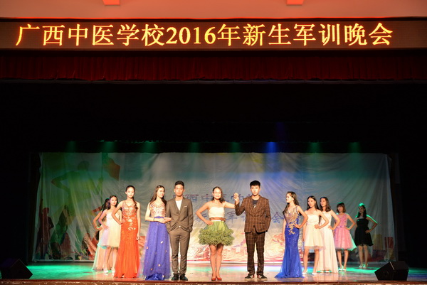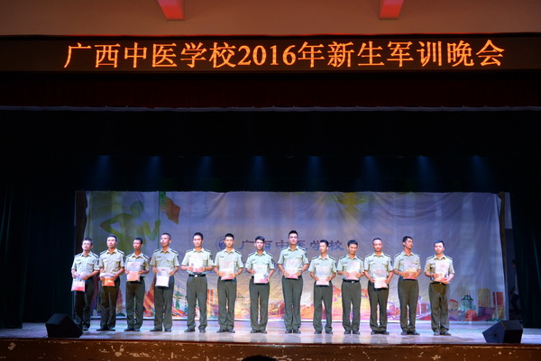 2016年9月3日晚上19:30分,广西中医学校2016年新生军训晚会在北湖校区大礼堂隆重举行。广西中医学校校长吴彬,副校长林原、黄勇、马秋平,校党委副书记罗艺徽,广西军区教导大队承训全体教官、班主任以及2016级新生参加了本次晚会。