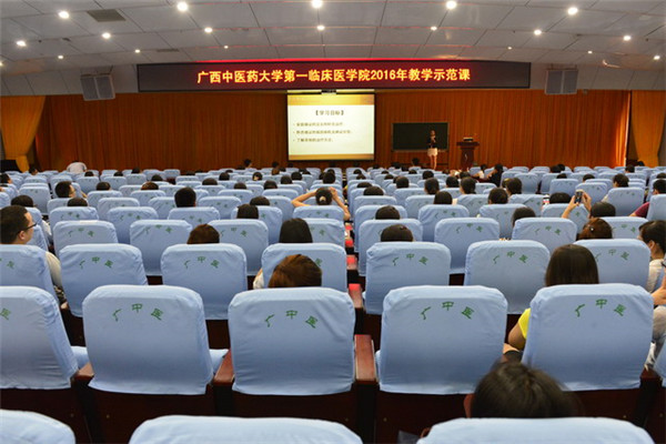为充分发挥优秀教师示范课的引领、带动作用,促进教师之间互相学习、交流,进一步提升第一临床医学院教师教学业务素质和教学水平,推进第一临床医学院教学改革,提高教学质量,2016年9月13日下午,第一临床医学院邀请在第四届“中医药社杯”全国高等中医药院校青年教师教学基本功竞赛中获奖的第一临床医学院优秀教师邓海霞、胡苗苗为广大教师作教学示范课。第一临床医学院副院长钟远鸣出席观摩并讲话,全院各级教师、进修生、规培生及学校各学院教师200余人参加了本次示范课。示范课由教学部副主任杜娟娇主持。