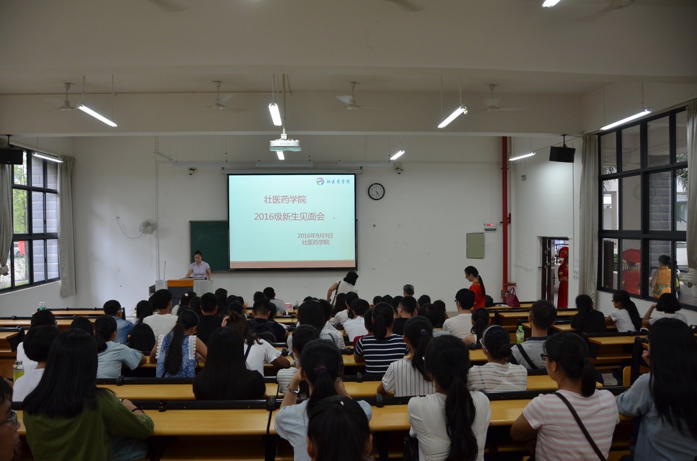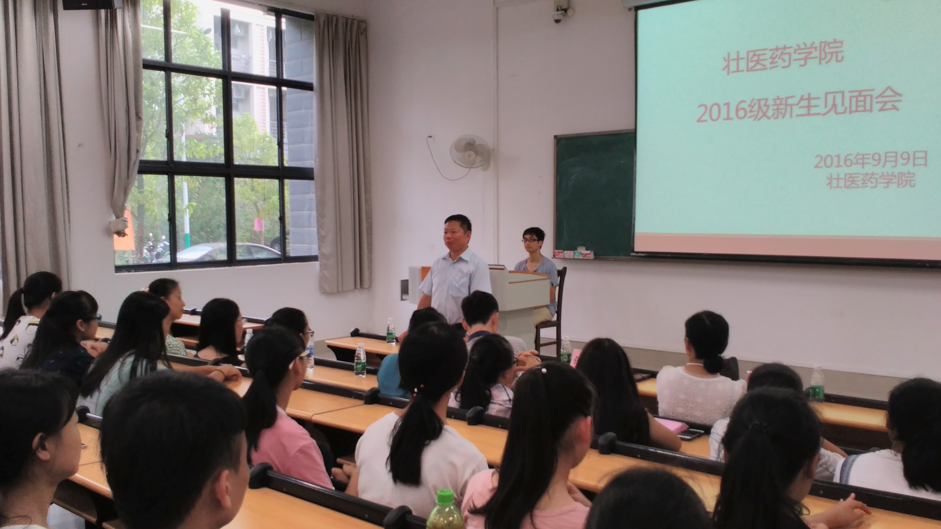 2016年9月9日下午4点30分,壮医药学院的迎新工作已接近尾声,学院组织新生于教学楼2-103召开了2016级新生见面会。壮医药学院党总支书记张煜教授、院长林辰教授、副处级调研员韦杏副教授、教学科研办主任温海成老师、壮药教研室主任梁宁老师、壮医基础教研室主任曾振东老师、学生办公室主任兰天莹老师、分团委副书记刘婷老师、2016级班主任何晓薇老师出席此次见面会。
