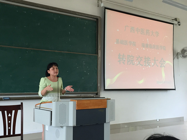 骨伤学院周红海院长、第一临床医学院钟远鸣副院长、基础医学院龙春莉副书记、瑞康临床医学院教务学生科莫启章主任和各学院学生工作办公室、教务学生科、学生党总支、团委等相关老师以及全体转系的学生出席了交接大会。