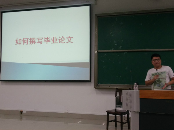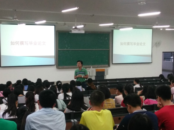 活动伊始,宋老师为此次活动致辞,他强调了撰写一篇优秀毕业论文的重要性。随后,李源老师介绍本次讲座的目的是在于加强应届毕业生撰写毕业论文的能力。接着,他围绕“选题、资料的搜集、论文写作的要求、论文的结构以及撰写学位论文的技术细则和容易出错的地方”等五个内容进行详细讲解。他指出,撰写毕业论文是检验在校大学生知识全面性的最后一次考验,是对学生基本知识、基本理论和基本技能掌握与提高的一次总测试。因此,每一位同学都需要高度重视。最后,此次活动在同学们热烈的掌声中圆满落下帷幕。