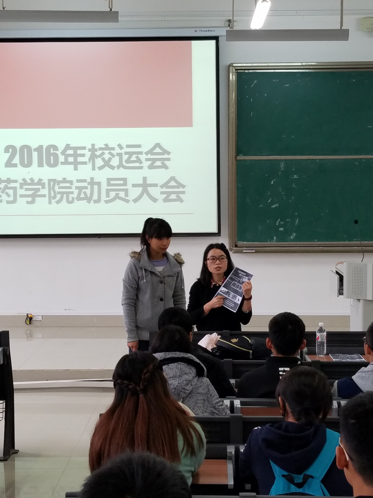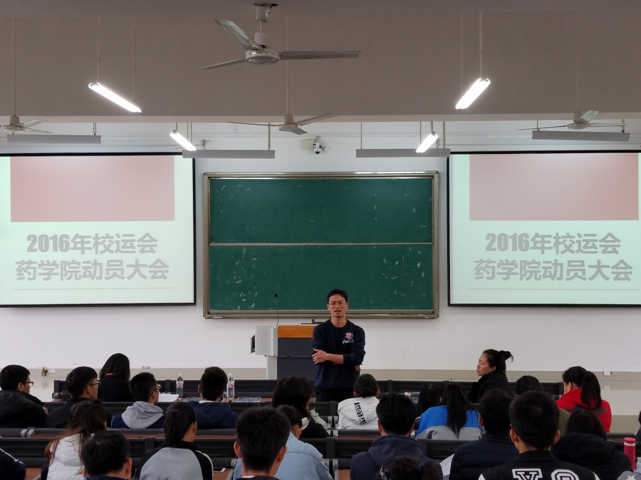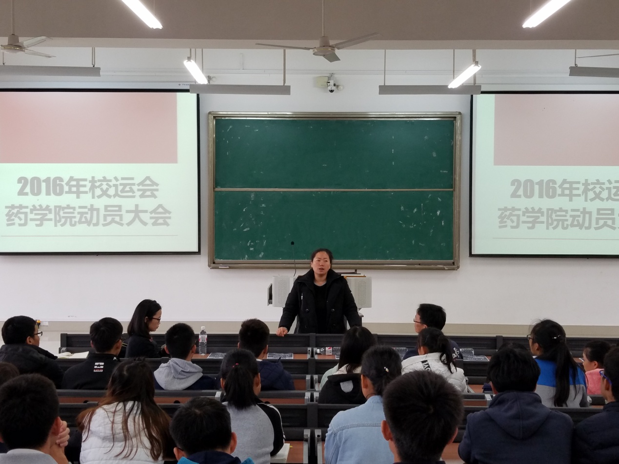 为积极备战鸭脖第38届大学生田径运动会,激发药学院运动员为学院争光的积极热情,药学院于2016年11月10日12点30分在仙葫校区1栋101召开药学院全体运动员动员大会。药学院党委副书记李豫萍、药学院学办主任凌勇威、药学院团委书记王金兰以及药学院全体运动员参加了本次动员大会。