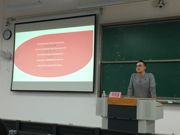 宋南老师向同学们介绍邓老师的留美经历和创业知识
