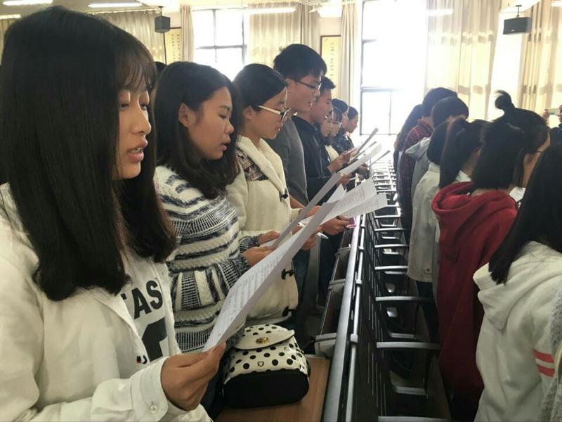 活动第二项,党支部全体成员朗诵2016年宪法晨读内容,每位学生手持2016年宪法程度内容,齐声朗诵,通过此活动,提高学生对宪法的认识程度和遵纪守法的自觉性。