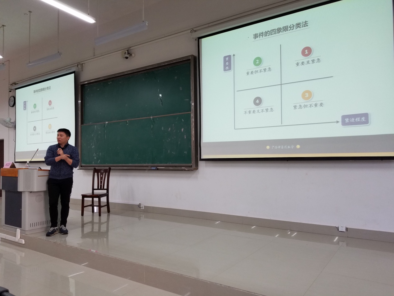 12月6日下午14点,学干培训于仙葫校区教学楼1栋101教室继续进行。首先由研究生团委书记杨思源老师进行主题为“时间规划的艺术”的培训。杨思源老师通过著名的四象限理论向同学们讲述了时间规划的重要性,并通过现场的小游戏介绍了处理事情的正确步骤与方法,同时向同学们推荐了规划时间的四样有效工具以及三本书籍。药学院学办主任凌勇威老师进行了有关就业方面的培训,通过“双选会”向同学们分析了各企业及岗位的情况,介绍了我院2017届毕业生基本情况,并剖析了目前就业工作存在的困难和问题,让学生更了解就业市场。