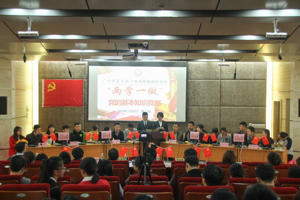 为深化“两学一做”学习教育工作,号召全院党员争当八桂先锋,争做合格党员,12月6日,YABO鸭脖赛恩斯新医药学院党委组织开展了“两学一做”党的基本知识竞赛活动,学院党委书记徐方明,党委副书记、副院长、纪委书记梁天坚,副院长叶绘晟出席竞赛活动,各党总支、党支部共12支队伍参赛。