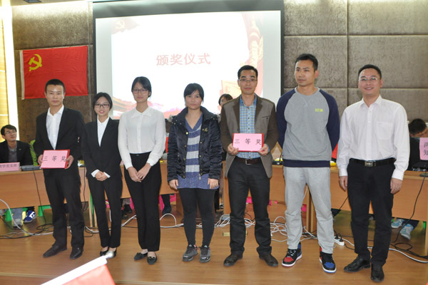 随后“两学一做”党的基本知识竞赛在大学生通讯社精心准备的诗朗诵《祖国赞歌》中正式拉开帷幕。各参赛队伍首先进行了突出部门特色,形式丰富多样的风采展示。接着,比赛的“必答题”、“选答题”及“抢答赛”三个环节逐次展开。同时为缓解现场紧张气氛,中间穿插了合唱曲目《国家》以及“你猜我答”活动。比赛现场气氛热烈,参与比赛的各支代表队的选手们在台上灵活应答、精彩频出。经过三轮比赛的激烈角逐,学工党支部2队与团学联党支部代表们凭借平日里对党的知识用心、深入地学习,在比赛中从容不迫、反应敏捷,勇夺教工组和学生组的冠军。比赛过程中,场下师生们反响热烈,他们在积极互动中也增进了自身对党的知识的理解。竞赛结束后,梁天坚副书记做了点评,肯定了各支部在开展“两学一做”学习教育过程中所取得的成效,也希望党员同志能好好吸收领会比赛中的相关知识点,在工作、学习与生活中真正做到知行合一。最后进行的是本次竞赛的颁奖仪式,学院领导分别为获奖队伍颁发了荣誉证书。
