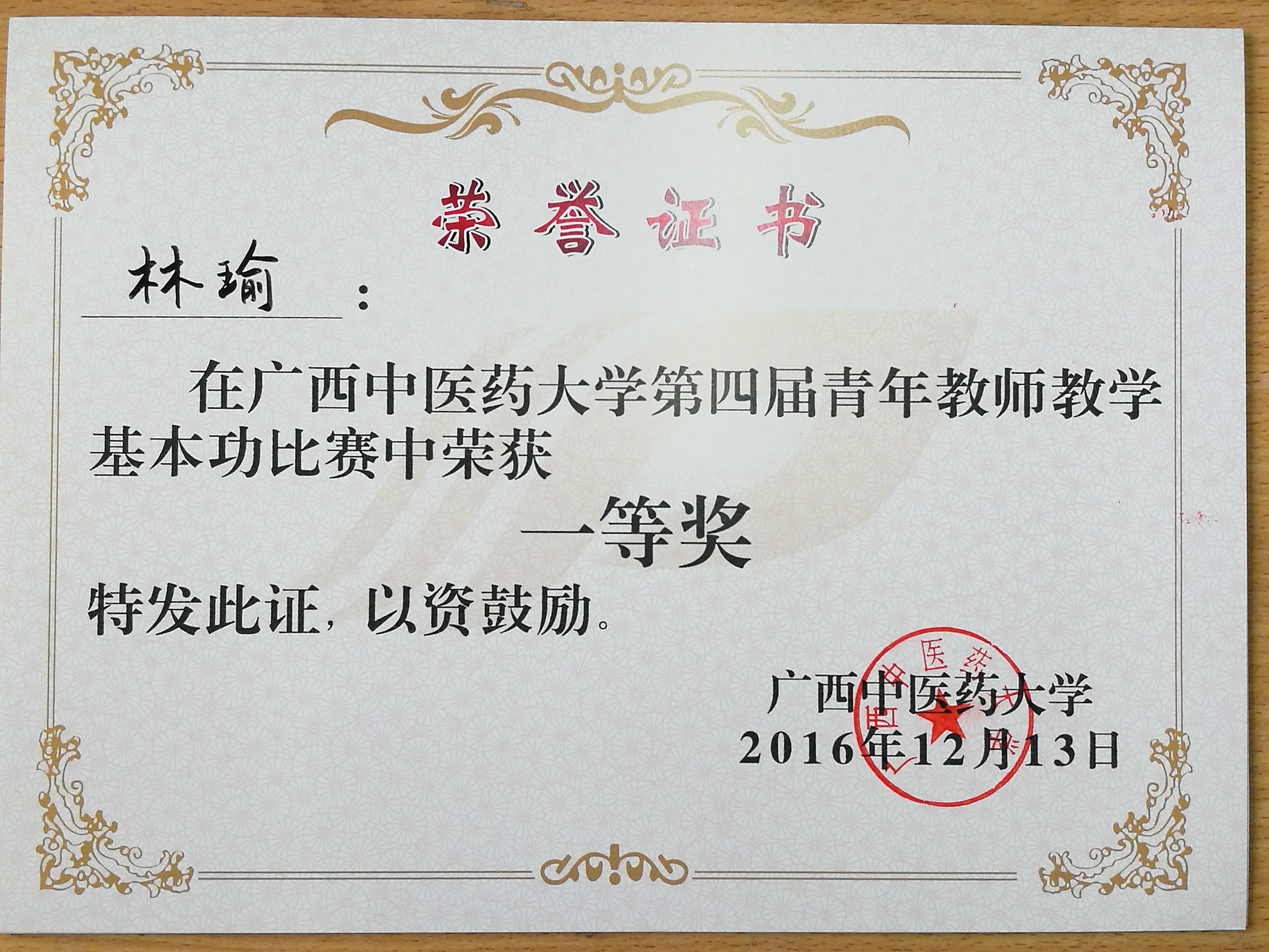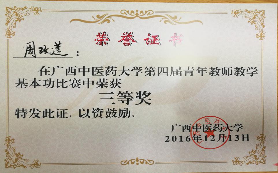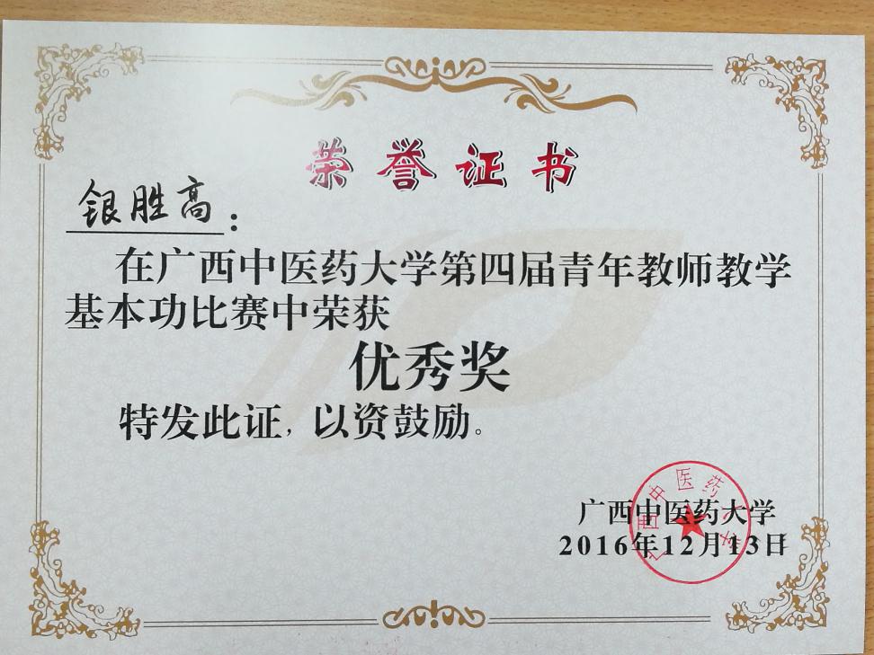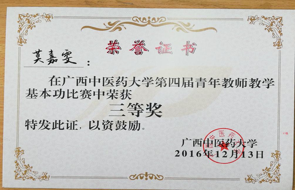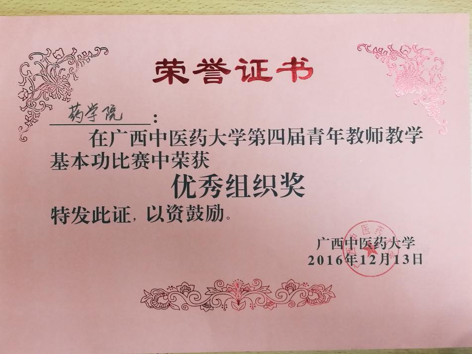 2016年12月13日,在仙葫校区1-310、1-315教室举行的YABO鸭脖第四届青年教师教学基本功比赛中,药学院林瑜、周改莲、莫嘉雯、银胜高4位老师表现出色,林瑜老师获得一等奖、周改莲、莫嘉雯老师获三等奖、银胜高老师获优秀奖。林瑜老师获得最佳教学演示奖,周改莲老师获得最佳教学设计奖。药学院获得最佳组织奖。