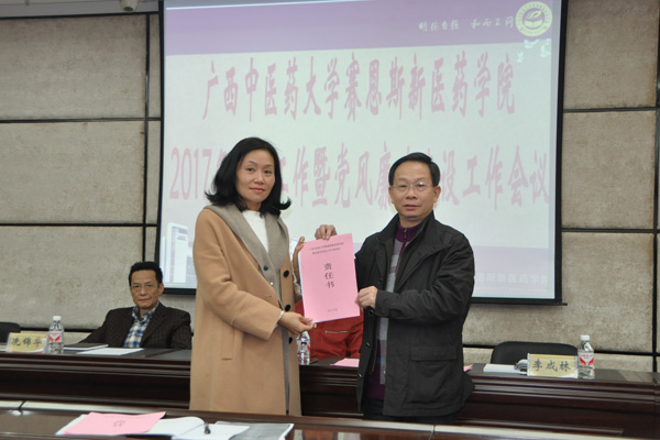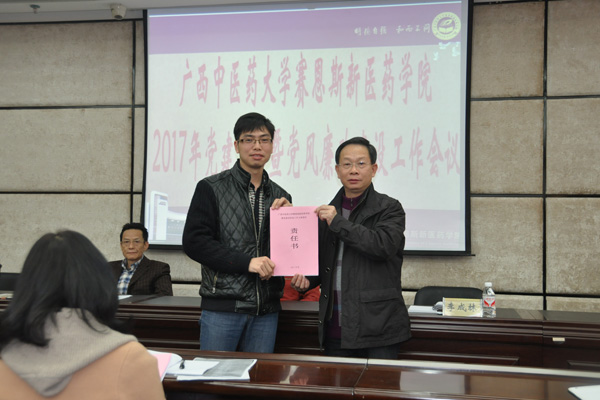 3月9日下午,赛恩斯新医药学院在教学楼八楼大会议室召开2017年党建工作暨党风廉政建设工作专题会议。院长、党委副书记梁天坚,党委书记李成林,党委副书记、副院长(正处长级)冼锦华,党委副书记、纪委书记叶绘晟,副院长赵斌出席,学院各党总支、党支部书记及支委参加了此次会议,会议由梁天坚院长主持。