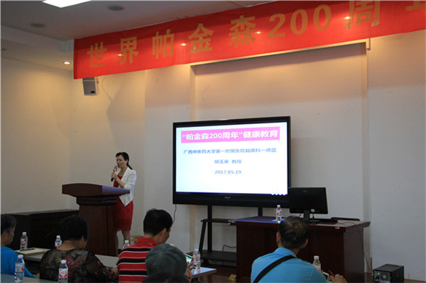 初夏之际,万物华实。适逢帕金森病命名200周年之际,为了让人们进一步了解帕金森病的诊治及相关知识,增强人们的健康意识和自我保健意识,倡导有益于健康的行为和提升自我保健能力,一附院脑病一区于2017年05月19日在一附院第二会议室举行“帕金森病”知识讲座及第二届“帕友之家”健康教育活动。本次活动共有约50名帕金森病患者及家属参与,活动由脑病一区科主任胡跃强主任主持,胡玉英教授作精彩讲座,胡教授就目前帕金森病的诊治新进展,指导患者如何科学合理用药,传授帕金森病的日常保健知识。讲座结束后与患者进行了互动并详细回答患者提问。最后胡跃强主任对本次活动进行总结,肯定了本次健康教育活动的意义及中西医结合治疗帕金森病的实效性,表示此类活动脑病科将经常开展,以更好的服务于更多的病人。