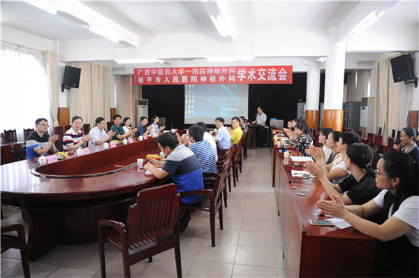 相互问候后学术交流于上午9时正式开始,桂平市人民医院医务部副部长何文评发表欢迎词并主持会议。学术交流会上,在浓厚的学术氛围中,双方先后在颅脑肿瘤、脑血管疾病、神经外科重症护理等方面进行了精彩的讲演和热烈的讨论。其中一附院外六科张高炼教授作题为《神经内镜经鼻蝶入路垂体瘤切除术》的讲演,韦可聪副教授作题为《颅内动脉瘤诊治进展》的讲演,黄建荣副教授作题为《血管介入治疗颅内复杂动脉瘤的体会》的讲演,得到了桂平市人民医院同行的高度评价,认为一附院在颅脑肿瘤、脑血管疾病的诊治方面走在了我区的前列。之后桂平市人民医院神经外科岑茂良主任医师作题为《复发胶质瘤再手术探讨》的讲演,蔡文强副主任医师作题为《蛛网膜下腔出血诊治体会》的讲演,他们的丰富病例、成熟的诊治技术也获得了一附院同行的赞叹。最后双方在重症护理、科室管理、科研合作、人才梯队培养、技术发展方向方面进行了深入的意见交换和探讨。
