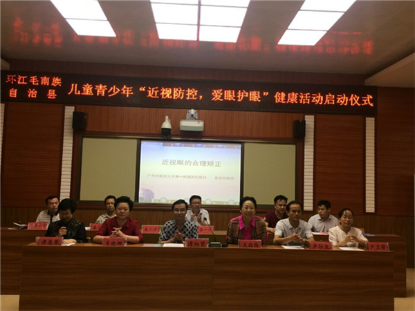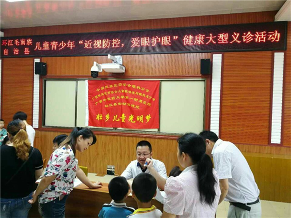 2017年6月6日,正值全国第22个“爱眼日”,医院副院长、广西优生优育协会副会长、广西优生优育协会儿童眼保健与眼视光分会会长吴西西教授带领一附院眼科团队一行7人,来到河池市环江毛南族自治县开展“广西优生优育协会专家下基层送知识、送技术、送健康、送幸福”主题义诊活动。此活动得到环江毛南族自治县政府、教委、卫计委、环江一小全体师生及环江妇幼保健院的支持,在学校举行了“近视防控,爱眼护眼”启动仪式。