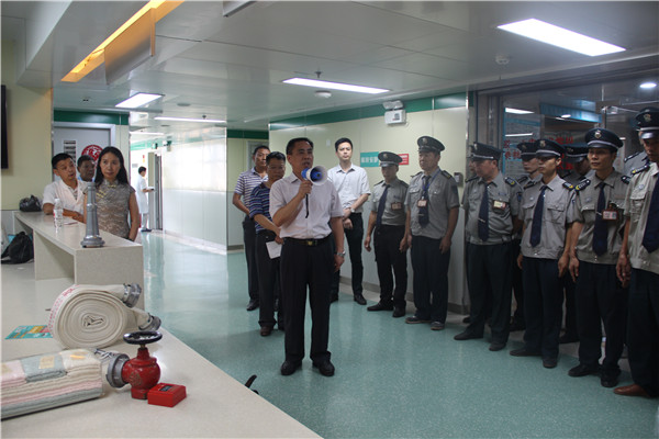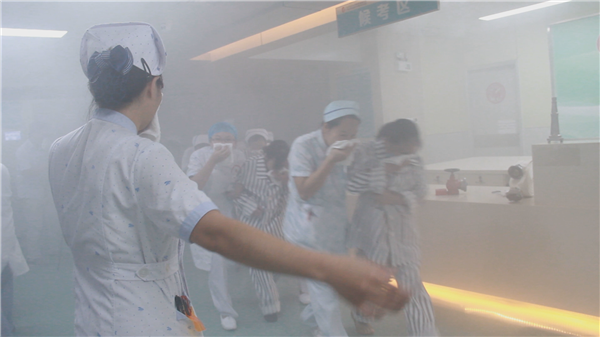 “演练开始!”随着唐院长一声令下,模拟火源被点燃,瞬时楼道内浓烟滚滚。医院消防控制中心接到火情报告后,立即呼叫全院所有保安奔赴病房参加灭火。保安到场后,一面投入灭火,一面立即协助转移病人。医生护士引导轻病人从安全通道撤离,重病人用担架抬出病房。火苗迅速被扑灭,病人全部被安全转移。整个过程紧张、有序、安全、快速。