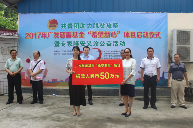 广发银行南宁分行副行长黄碧琴向广西青少年发展基金会副秘书长苏瑜捐赠了“广发慈善基金‘希望新心’项目捐款人民币50万元”牌匾,帮助先天性心脏病患儿。