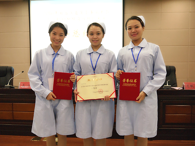 除了在工作中以护士的职业操守严格要求自己,在学习上,她也毫不懈怠。每年医院举办的各项比赛,总有她踊跃积极的身影,尽可能发挥自身的优势与特长,不断地充实自己,提高各方面的素养。在2015-2017年期间,分别获得“护理教研室青年教师教学基本功比赛”二等奖,“中医特色护理技术成果展示大赛”一等奖,“庆祝中国共产党成立94周年经典诗文朗诵比赛”二等奖,“庆祝护士节暨诵读比赛”一等奖。而这些荣誉的背后,却是她无数个日夜的辛勤努力和刻苦钻研。她一直坚信,机会是留给有准备的人,虽然努力付出不一定会有回报,但不努力,成功只会离自己越来越远。此外,在医院领导及护理部的指导与帮助下,她还积极参加区级以及国家级的比赛,通过层层筛选在广西赛区崭露头角,最终有机会参加第一届全国“医院感染防控,最佳临床护理实践”讲课比赛,并获得“优秀奖”,同年代表医院参加广西壮族自治区直属企事业工会医疗机构护理岗位技能竞赛,获得“三等奖”,2017年参加中国神经内科青年医师风采大赛演讲比赛“赛区晋级奖”。奋斗拼搏的道路,是艰难和险阻,是汗水和泪水搭建而成的。她曾因为忍受不了高强度的训练而默默留下眼泪,因为无法达到要求而沮丧得想过放弃,最终以坚定地信念,坚韧的性格,高度的思想觉悟,坚持完成了每一次比赛。