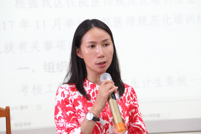 培训会上,陈日兰向同学们介绍了当前面临的考核政策与形式,指出本次考核工作由自治区卫生计生委统一组织,由各相关住院医师规范化培训基地负责具体考务工作,并同学们介绍了本次考试各项工作的负责老师,以及考试时间、内容、形式等具体细节。同时她强调,规培学员一定要承担起教学任务,鼓励大家在规培过程中与带教学生一起刻苦钻研,勤于练习。她详细地解释了考核站点的内容以及注意事项,例如建立临床思维,注意人文关怀、爱伤观念,牢记无菌观念等。