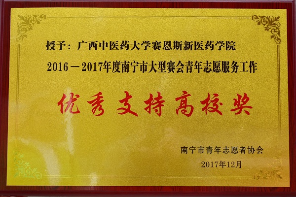 喜讯:赛恩斯新医药学院荣获2016-2017年度南宁市志愿服务工作“优秀支持高校奖”