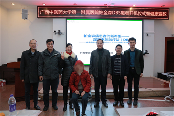 在开机仪式上,胡跃强介绍了一附院脑病科一区的基本情况,一附院脑病科一区是中国帕金森病联盟成员,以胡玉英教授为组长的帕金森病与运动障碍专业组多年来在治疗帕金森病方面积累了丰富的临床经验,救治了许多帕金森病患者,并与这些患者结下了深厚的友谊,建立了帕友之家,并且在DBS治疗帕金森病方面开创了广西中医医院的先河。本次帕金森病DBS患者开机仪式,是希望借此契机与医院各科室优势专业联合,增进各学科间的交流与发展,为患者提供最佳诊治方案。随后,胡玉英教授为大家进行了《帕金森患者的新希望-深部电刺激疗法(DBS)》的健康宣教,详细介绍了深部电刺激疗法的适应证、禁忌症,日常护理等等。最后,卢健棋为我院帕金森DBS患者进行了开机。