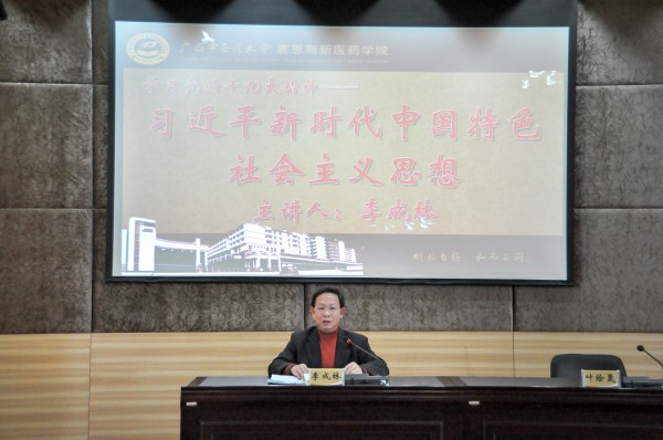 李成林用精辟的语言、生动的事例作了题为《习近平新时代中国特色社会主义思想》的专题报告。他从新时代中国特色社会主义思想的形成、主要内容和重大历史贡献等方面,为全体师生党员进行了深入浅出、全面系统的解读和阐释,使全体党员对十九大精神有了更加准确、更加透彻、更加深入地理解和把握。李成林对赛院深入开展学习贯彻党的十九大精神进行了安排部署:一要切实把思想和行动统一到学习贯彻习近平新时代中国特色社会主义思想和党的十九大精神上来,紧密团结在以习近平同志为核心的党中央周围,高举习近平新时代中国特色社会主义伟大旗帜,为实现中华民族伟大复兴的中国梦,实现人民对美好生活的向往努力奋斗。二要加强党支部建设,推动十九大精神在基层落地生根。广大干部和党员要继续发扬党员的先锋模范作用,工作上任劳任怨,讲奉献,自觉地将学习教育与工作实践、问题解决、能力素养提升结合起来,要自觉地将学习教育融入到日常工作中,进一步增强“四个意识”,将学习成果转化为工作成绩。三要做好传承发展中医药事业。党的十九大报告明确指出“传承发展中医药事业”,对中医药发展有了新定位、新要求,我们作为中医药教育的院校,要从新的起点上推进中医药卫生事业发展的高度来认识党的十九大的重要意义,为推进“健康中国”做出新的更大的贡献,服务“一带一路”,着力培养高素质的中医药人才,让中医事业走出向世界,服务和造福于更广泛的群体。