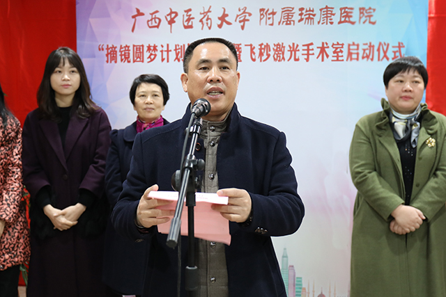 1月29日上午11时18分,瑞康医院在A座5楼举行“摘镜圆梦计划”暨飞秒激光手术室启动仪式,广西红十字会副会长潘雪红,YABO鸭脖校长助理、校长办公室主任黄龙坚,YABO鸭脖团委书记王春花,广西卫生职业技术学院团委副书记孙雪婷,广西红十字基金会理事长易大瓦、秘书长何国杰,广西青少年发展基金会副秘书长苏瑜受邀出席仪式。瑞康医院院长唐友明,党委副书记、副院长陈日兰,副院长庞刚、韦思尊,党委副书记、纪委书记黄建民,副院长陈锋及医院各临床、门诊、医技、行政职能科室中层干部代表参加仪式。高宏君书记主持仪式。
