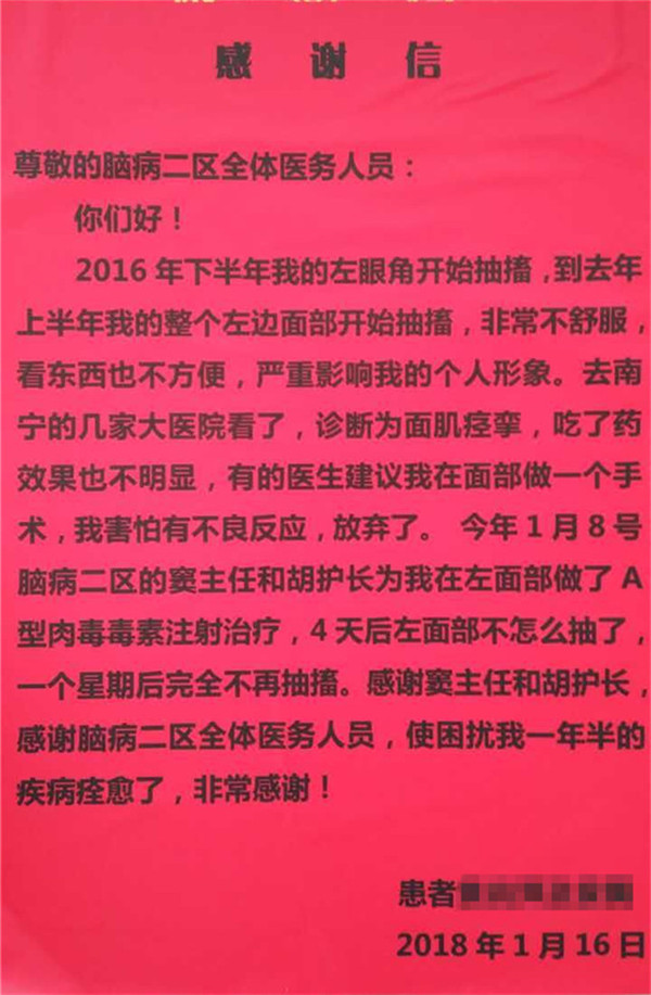 近日,一附院脑病科二区多例肉毒素注射技术治疗治疗局限性肌张力障碍的患者,包括三叉神经痛、面肌痉挛等患者已顺利康复出院。A型肉毒素注射治疗为减轻患者病痛,提高生活质量提供了更好的方法,有很好的示范效果。