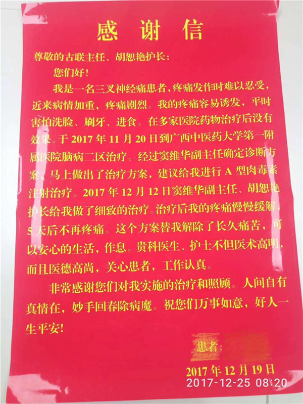 患者李阿姨1年前无明显诱因下出现左侧面部刺痛,疼痛可放射至牙龈,曾多次外院就诊治疗,诊断“左三叉神经痛”,上症反复发作,药物治疗效果差,疼痛难以忍受,长期下来出现精神紧张、焦虑、抑郁。李阿姨诉初期起病时发作次数较少,服用卡马西平片可缓解,初期间歇期亦长,数分钟、数小时不等,随病情发展,发作逐渐频繁,间歇期逐渐缩短,疼痛亦逐渐加重而剧烈。容易诱发,说话、吃饭、洗脸、剃须、刷牙以及风吹等均可诱发疼痛发作,以致行动谨小慎微,甚至不敢洗脸、刷牙、进食,说话也小心,惟恐引起发作。一附院古联主任、窦维华副主任医师结合患者病史、体征,认为患者诊断明确,2017年12月12日,窦维华副主任及胡怒艳护长给李阿姨左三叉神经部位进行A型肉毒素注射治疗,麻痹三叉神经。治疗后,李阿姨疼痛逐渐缓解,发作次数减少。