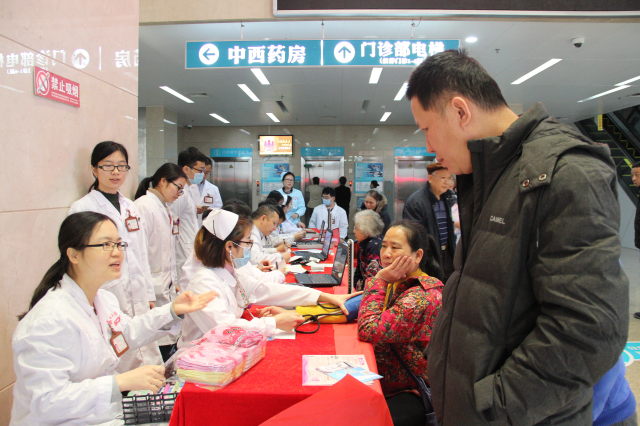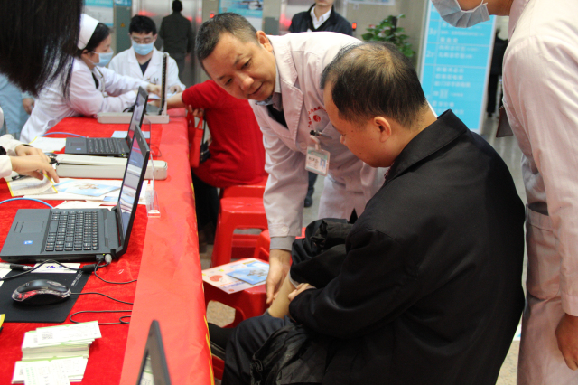 早上八点半,肾病内科主任黄仁发博士、副主任向少伟博士带领肾病内科医护团队开展义诊活动,医护人员各司其职,免费为需要的患者提供健康咨询和指导,为患者提供尿常规、血压、体温等检测服务并派发科普宣传册、小礼品等。