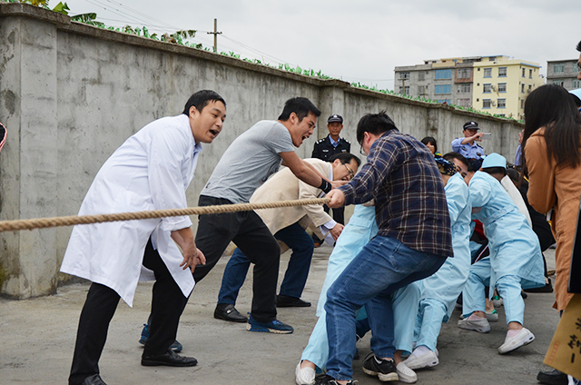 在比赛现场,由田阳院区各科室组成的8个参赛队按照抽签排序进行拔河比赛。参赛选手们个个精神抖擞、激情满怀,双手攥紧粗绳,身子后仰,脚弯成弓步,使出全身力气,两队选手你来我往,场面十分激烈。赛场下啦啦队的呐喊声、欢呼声、喝彩声彼此起伏,不绝于耳。