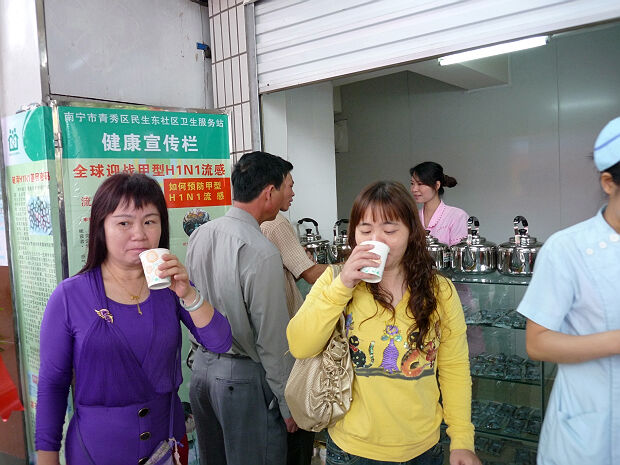 [图文]附属瑞康医院研制出预防H1N1流感茶 日期:2009-05-11 点击数: 次 分享到: 近日,广西开展预防猪流感工作正在紧锣密鼓地进行。附属瑞康医院共和路专家门诊部为了配合猪流感防病工作,组织部分名老中医研制预防H1N1流感茶。本茶具有提高免疫力、清热解毒、祛湿等功效。5月8日,该门诊推出“国医药饮品” 预防H1N1流感茶开业。医院党委书记厐宇舟教授、青秀区卫生局詹副局长以及医院部分科主任前来参加开业仪式。图为瑞康医院共和路专家门诊部“国医药饮品”开业以及市民们在服赠饮预防H1N1流感茶。 (附属瑞康医院 韦丽山) 打印正文 关闭本页