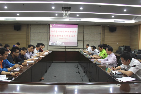 4月25日下午,赛院在八楼大会议室召开专题会议,传达学习全区加强和改进高校思想政治工作会议精神、部署学院安全稳定工作和廉政风险防控工作。学院领导班子、全体中层干部、各党总支、支部书记和全体辅导员参加了会议,党委书记李成林主持会议。