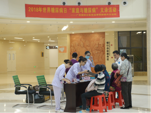 11月14日是第12个“联合国糖尿病日”,今年的主题是“家庭与糖尿病”。当天上午,广西国际壮医医院肾病肺病内分泌科在医院门诊大厅一楼开展2018年世界糖尿病日义诊活动,为市民朋友提供免费体检、健康宣讲、答疑解惑等服务。