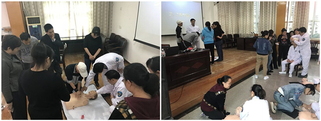 妇产科蓝雪琴主任从女性生殖期常见问题、妇女各阶段保健的关注点、宫颈癌防治等女性较为关注的问题作为切入点,用通俗易懂的语言,深入浅出的讲解,让在场的干部职工能够充分了解各类妇女健康的知识。急诊科胡嗣钦副主任带领的急诊团队通过理论授课和实际操作相结合的方式,形象具体的向干部职工们普及了心肺复苏、止血、包扎、骨折固定、人工呼吸、烧伤、异物窒息、溺水等多个常见危及状况的急救知识。通过实际操作演练,加深了他们对急救知识的理解和掌握,讲座现场气氛活跃。