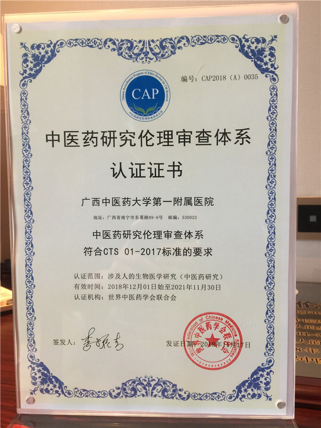 11月17日,世界中医药学会联合会在广州举行了“世界中联伦理审查委员会第八届学术年会”,会上为2018年通过“中医药研究伦理审查体系(CAP)认证”的10家单位进行授牌。一附院党委书记桂雄斌教授参会并代表一附院接受“中医药研究伦理审查体系(CAP)认证”的授牌及证书,目前全国共有43家单位通过CAP认证。据此,一附院成为广西区仅有的1家通过国家“中医药研究伦理审查体系(CAP)认证”的科研医疗单位。