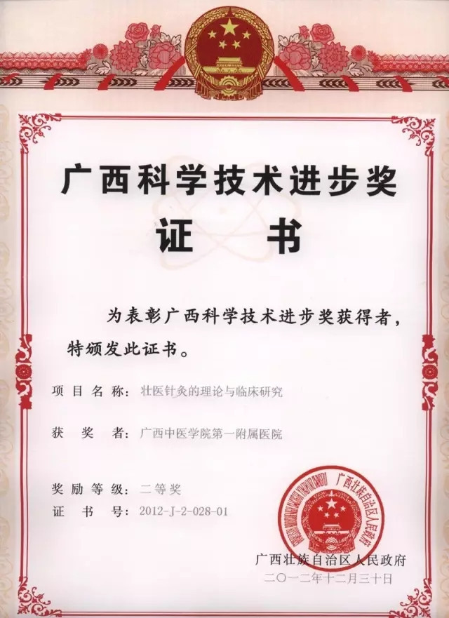 壮医领域首次获得的省部级科技进步二等奖
