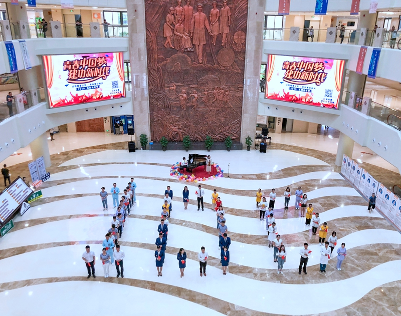 4月30日早上,广西国际壮医医院门诊大厅和往常一样,人来人往,患者们正在挂号、取药、就医。忽然,一位青年慢慢走向大厅中央的钢琴,奏响乐曲,另一侧,一位女生拿出小提琴加入演奏……更多的国壮青年从四周走来,渐渐聚拢,围绕在乐手周围时而舞动身姿,时而变换队形,一同吟唱《长城谣》、《光荣啊!中国共青团》、《我和我的祖国》、《我和2035有个约》,中间还穿插了配乐诗朗诵《青春中国》、歌伴舞《年轻的朋友来相会》……他们头顶传递国旗与团旗,手中挥舞着小国旗,举着青春励志牌,群情激昂,展现着新时代新青年的蓬勃风采,深情表达对祖国的热爱与祝福。