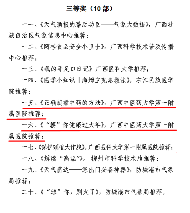 近日,自治区科技厅公布了“2019年广西十佳科普视频”大赛结果,由一附院推荐参赛的3个科普视频全部荣登榜单,其中“种草平价小技能 这些‘春节病’有救了”获一等奖,“正确煎煮中药的方法”、“‘腰’你健康过大年”获三等奖。