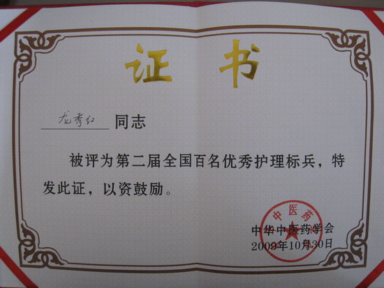 近日,瑞康医院护理部副主任龙秀红同志从北京召开的“第二届全国百名优秀护理标兵表彰大会”上载誉而归,喜获“第二届全国百名优秀护理标兵”荣誉称号。