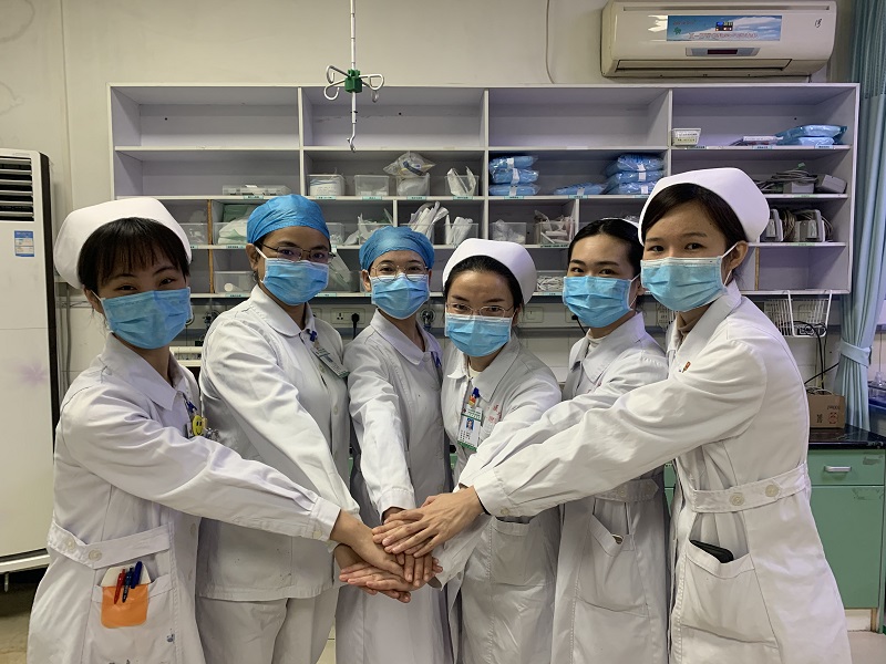 第一批志愿者(左起:脾胃二区邓智伶、推拿科张希、肾内科李丽、肿瘤一区农彩芬、心内二区岑思蓓、儿科莫映霞)