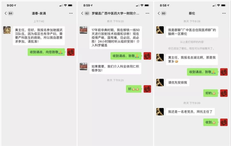一附院发出驰援武汉的号召后,得到了护士们的积极响应。有14个科室的护理人员(除休产假人员外)全员请战;有的护士提前结束休假,在回程的车上写下战书……作为一附院护理部主任,黄沂在看到护士们的请战书时内心充满了感动。她在自己的请战中这样写到:“当前武汉疫情防控形势严峻,生命重于泰山,疫情就是命令,防控就是责任!我自愿申请加入前线防控的队伍,到武汉,到疫情防控最需要的地方!我的优势在于:是自治区卫健委应急医疗队队员,2008年曾入选广西赴汶川医疗救护队(待命出发),有急诊、ICU、呼吸内科和心内科护理工作和护理管理工作经历,身体和心理状况良好,定能不辱使命,不负重托!”