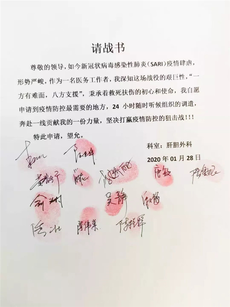 肝胆外科医务人员在集体请战书中这样写到:“如今新冠状病毒感染的肺炎疫情肆虐,形势严峻,作为一名医务工作者,我深知这场战役的艰巨性,方有难面,八方支援,秉承着救死扶伤的初心和使命,我自愿申请到疫情防控最需要的地方,24 小时随时听候组织的调遣,奔赴一线贡献我的一份力量,坚决打赢疫情防控的阻击战!”