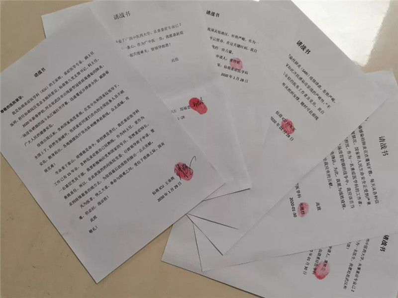 在仙葫重症医学科,6名医生及21名护士写下了请战书。科主任王荣辉在请战书中写到:“我在重症医学科工作已有15年余,各种危重症救治已很熟练,作为科主任,更作为一名基层党员干部,我要积极响应党和国家的号召,发挥重症特长,勇挑重任。所以,在此我强烈的向医院党委、行政领导班子申请,要求到疫情最重的地方去,为取得最后抗疫胜利做出一点点贡献。”