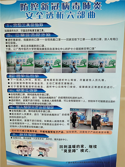 疫情当前,血透净化中心在疫情早期就开始积极关注,春节前便通过网络要求全员参加了新型冠状病毒引起的肺炎知识的培训,随后仍然不断加强培训,让医护人员及工勤人员掌握相关知识。加强消毒和洗手培训,要求医护人员严格做好自我防护。在中心制作了简单明确的宣传资料,给透析患者全覆盖宣传。