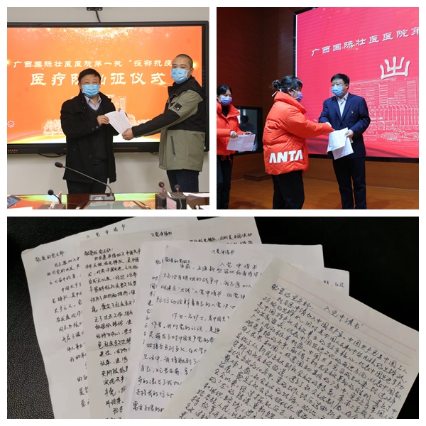 党员身先士卒,非党员也积极向党组织靠拢。出征仪式上,莫凡、胡春明、唐伶俐、黄慧、邓辉、丁益燕等医疗队队员郑重地向党组织递交了入党申请书,以实际行动接受党组织考验,表达了向党靠拢、听党指挥的坚定决心,也体现了这些医疗队员以党员的标准要求自己,无私奋战在一线,为人民群众的健康贡献力量的信念。