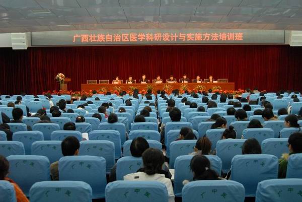 由广西区卫生厅主办、广西中医学院第一附属医院承办的自治区继续医学教育项目“医学科研设计与实施方法培训班”于2009年11月20-22日在中医一附院学术厅隆重举行。会议由中医一附院副院长韦艾凌博士主持,广西中医学院院长朱华博士、区中医药管理局庞军局长、广西卫生厅科教处耿文奎处长、谢裕安副处长、广西中医学院科教处处长唐乾利教授、一附院李敏智书记、院长黄贵华博士等领导出席了开幕式并作了重要讲话。