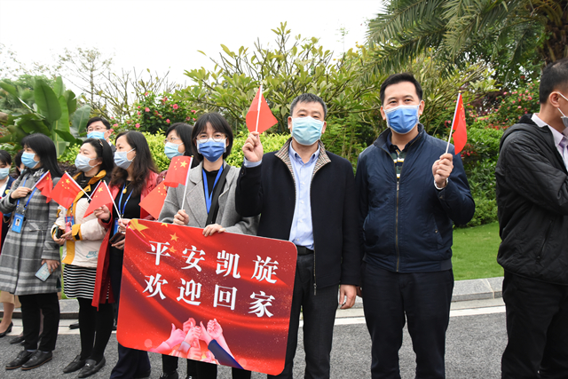 4月1日,经过14天规范隔离,广西支援湖北医疗队首批返回人员解除医学隔离观察,附属瑞康医院参加赴湖北抗击疫情的医务人员沈飞平安“回家”。自治区人民政府副主席黄俊华在自治区卫健委主任廖品琥及自治区新冠肺炎疫情防控指挥部有关同志的陪同下为他们举行了简短的欢迎仪式,附属瑞康医院副院长韦思尊带领医务部等部门同事迎接沈飞。