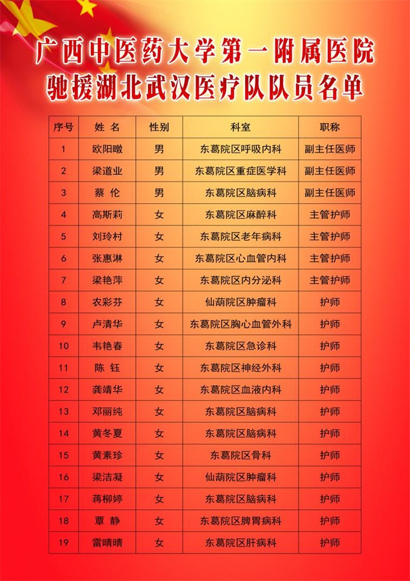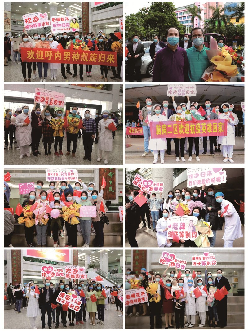 在这场新冠肺炎疫情阻击战中,一附院驰援湖北武汉医疗队19名队员守护沌口方舱医院,转战协和重症病房,所在的广西第四批驰援湖北医疗队也成为广西唯一一支两地“战斗”的队伍。至此,一附院26名驰援湖北医疗队队员已全部平安归来与家人团聚。在忘我奋战的日日夜夜,一附院医疗队全体队员同时间赛跑、与病魔较量,不辱使命、不负重托,出色地完成了各项支援任务,用实际行动诠释了大爱无疆、医者仁心的崇高精神。