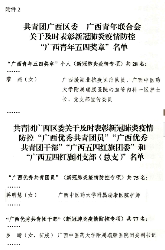 其中,附属瑞康医院心血管内科一区护士长黎燕被授予“广西青年五四奖章”(新冠肺炎疫情专项),医院护师、团委副书记罗晴被授予“广西优秀共青团干部” (新冠肺炎疫情专项),神经内科二区护师蒋明慧被授予“广西优秀共青团员”(新冠肺炎疫情专项)。