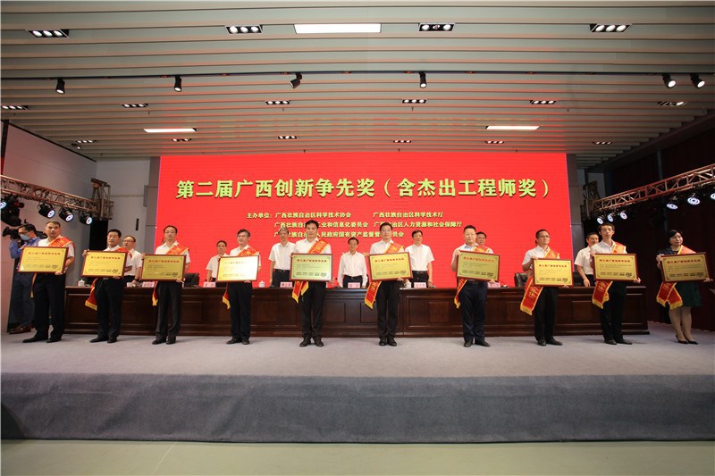 陈武等领导一同为第二届广西创新争先奖集体奖代表颁奖,一附院院长谢胜(前排左四)代表一附院团队接受表彰