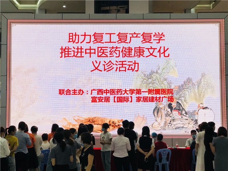 为助力企业复工复产,打赢疫情防控和恢复生产“两场战役”,引导员工和商户掌握必要的医学健康知识,不断提升自己身心健康水平与丰富养生理念,应富安居[国际]家居建材广场邀请,一附院于6月5日上午,由外联拓展部组织一附院心血管科黄明剑主任医师、脑病科梁妮主任医师、康复医学科陈广辉副主任医师,王伟医师和黄芳琴医师;仁爱分院妇科周金花副主任医师、仁爱分院中医内科莫喜晶医师,到富安居建材广场,进行义诊与疾病诊疗咨询活动。