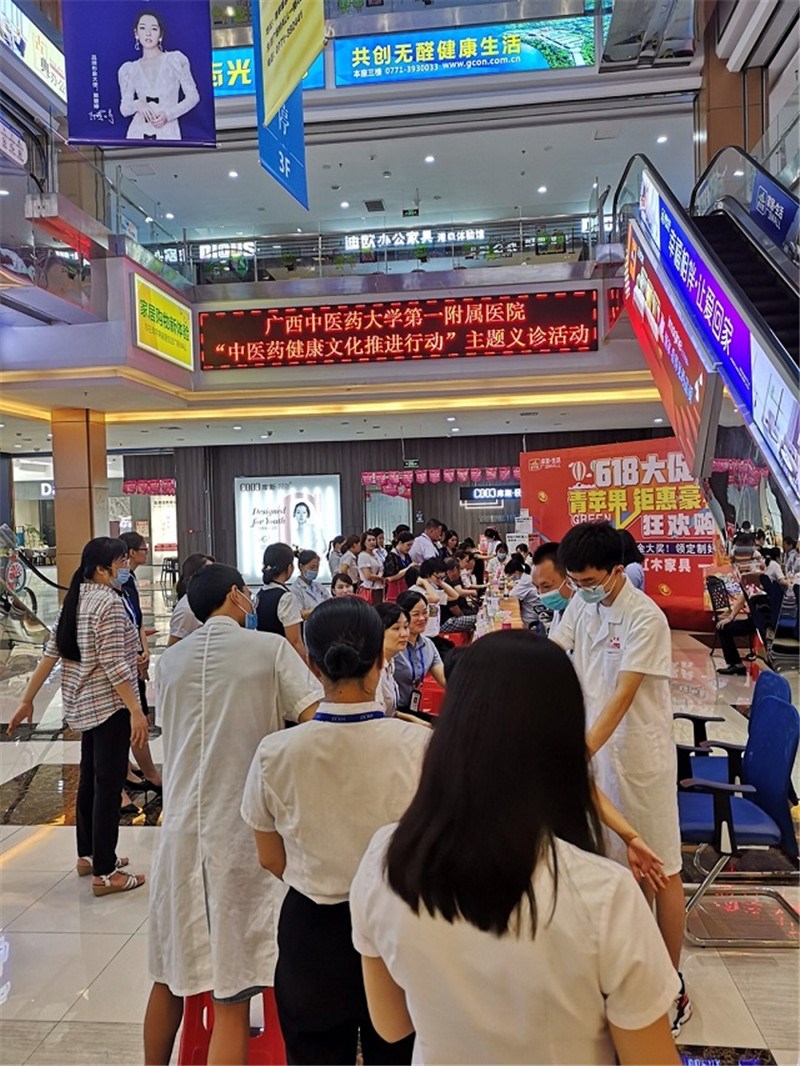 6月23日上午,一附院应邀到南宁市青苹果家居广场开展义诊活动,康复医学科、仁爱分院妇科、中医内科、小儿推拿科、东葛院区风湿病科等科室的15名医护人员参加义诊。